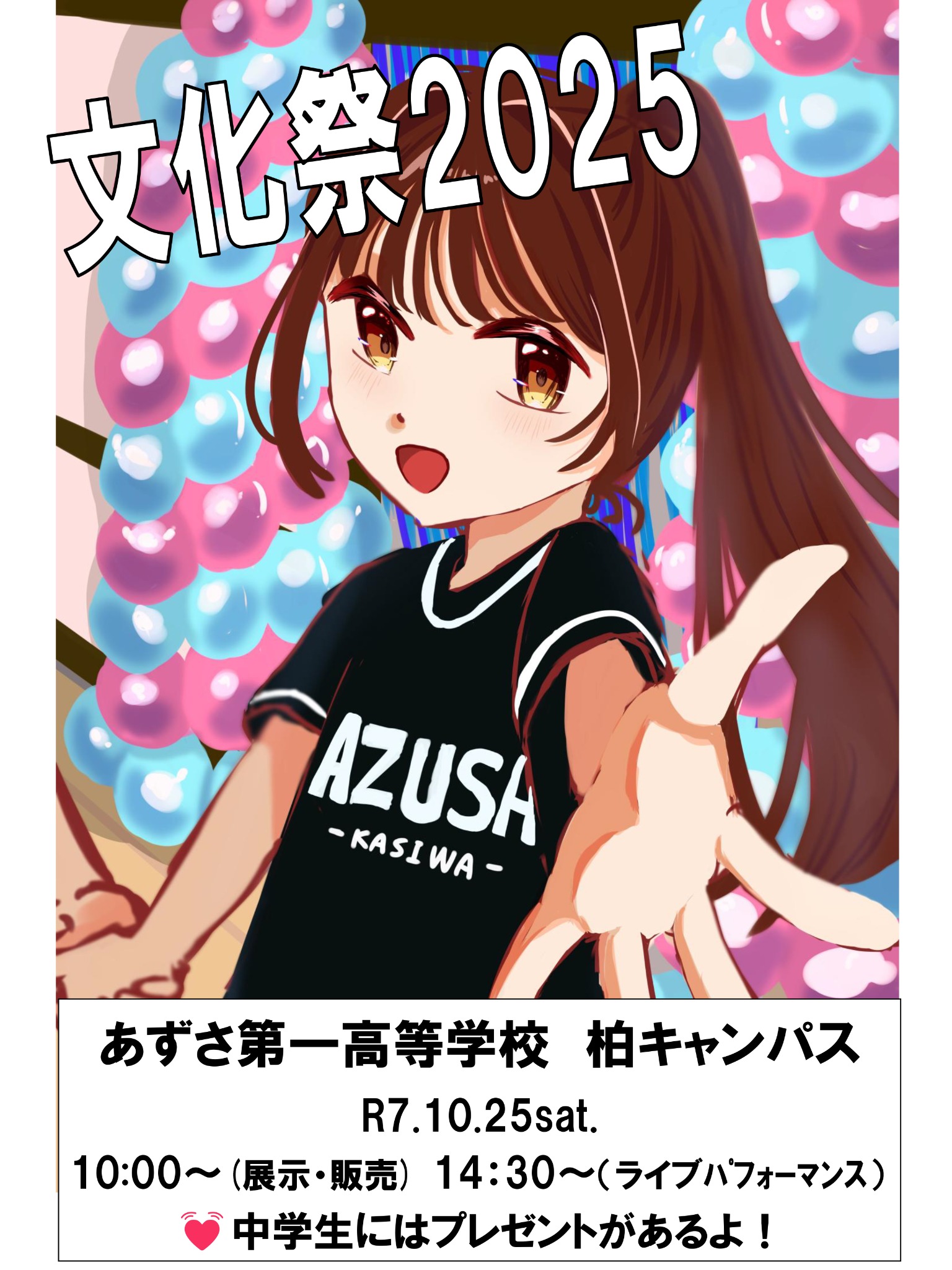 「文化祭」開催!@柏キャンパス 柏2025-09-29 17:00 <<柏キャンパス>>10/25(土)「文化祭」開催します!各年次の出店、ライブパフォーマンスもあります!中学生の皆さんにはプレゼントがありますので、ぜひご来校ください!※予約は必要ありません。直接ご来校ください!地図はこちら!☎04-7145-1023 柏キャンパスインスタグラム始めました♪