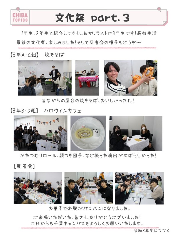 文化祭 Part.3 千葉2025-11-14 09:00 10月25日(土)、26日(日)と文化祭を行いました!年次ごとに3回に分けてお届けします♪最後は3年次生!平日の学校説明会も実施しております!体験授業もありますよ♪インスタも見てね📷