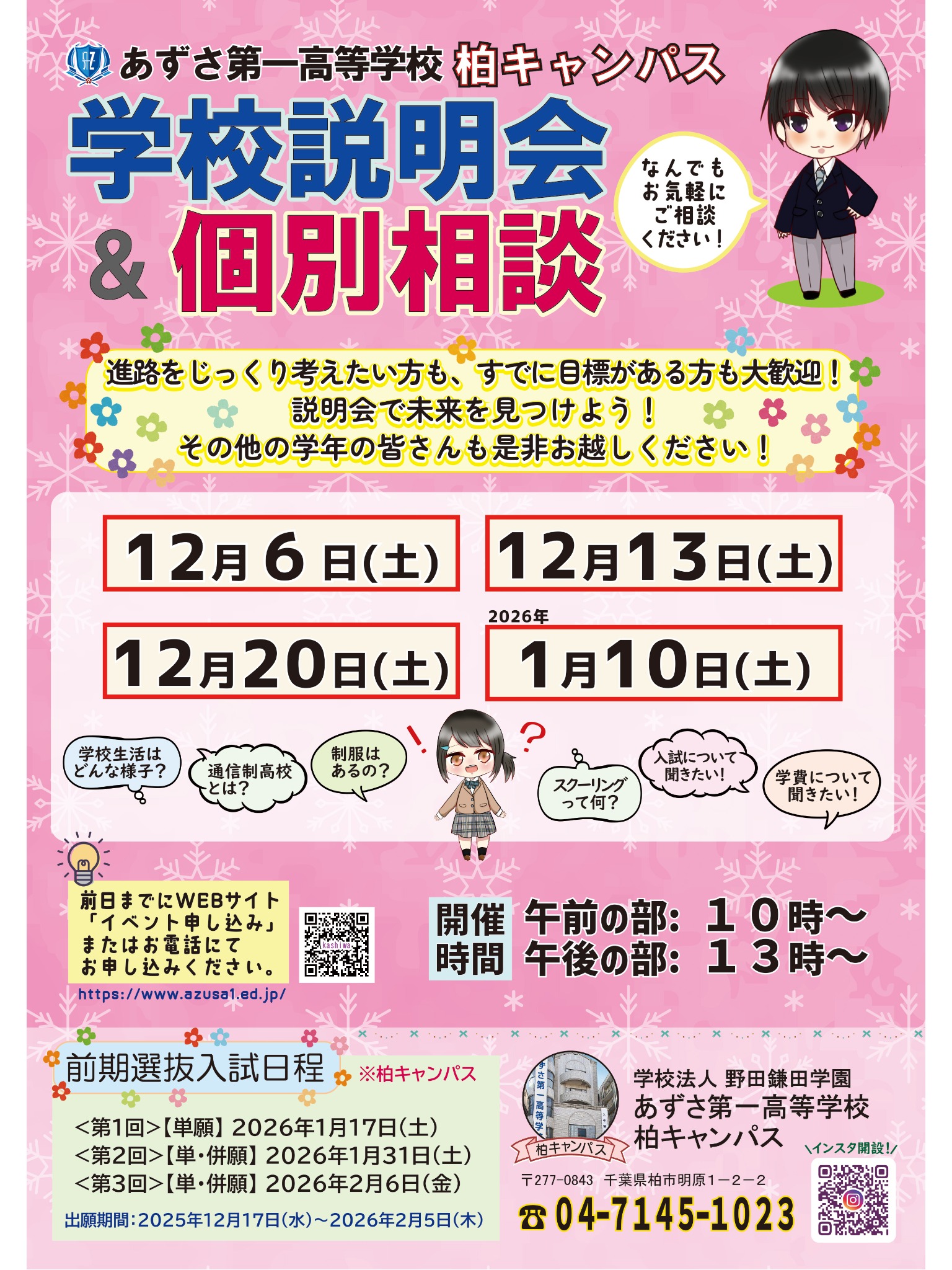 冬の「個別相談」開催します!@柏キャンパス 柏2025-12-05 15:30 柏キャンパス冬の「学校説明会」&「個別相談」を開催します!ぜひご参加ください!お電話またはイベントページからお申込みください!tel: 04-7145-1023 柏キャンパスインスタグラム始めました♪※日々の最新情報発信中!※